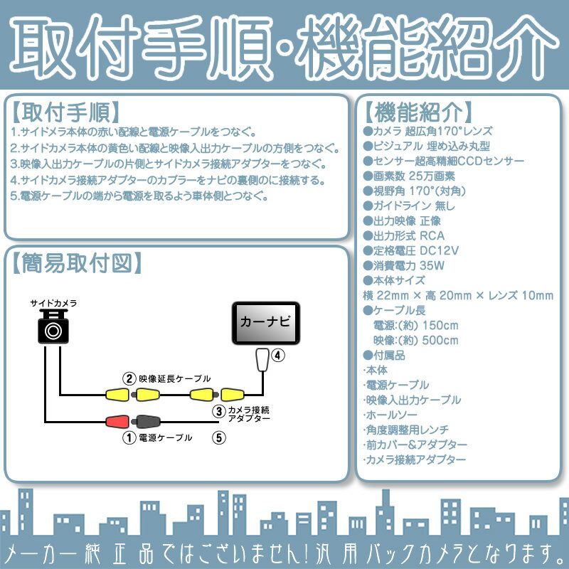 ◆商品仕様 外観 丸型 固定方法 埋込固定 センサー CCD 視野角 広角170° 出力映像 正像 ガイドライン 無し 映像出力端子 RCA 定格電圧 DC12V 本体サイズ 約φ22mm × 約20mm 電源ケーブルの長さ 約150cm 映像ケーブル長さ 約500cm ◆付属品 ・サイドカメラ本体 × 1 ・電源ケーブル × 1 ・映像ケーブル × 1 ・ホールソー × 1 ・角度調整用レンチ × 1 ・映像出力変換アダプター × 1 ◆注意事項 ※必ずサイズ・形状・適合等をご確認の上、ご入札・ご購入ください。